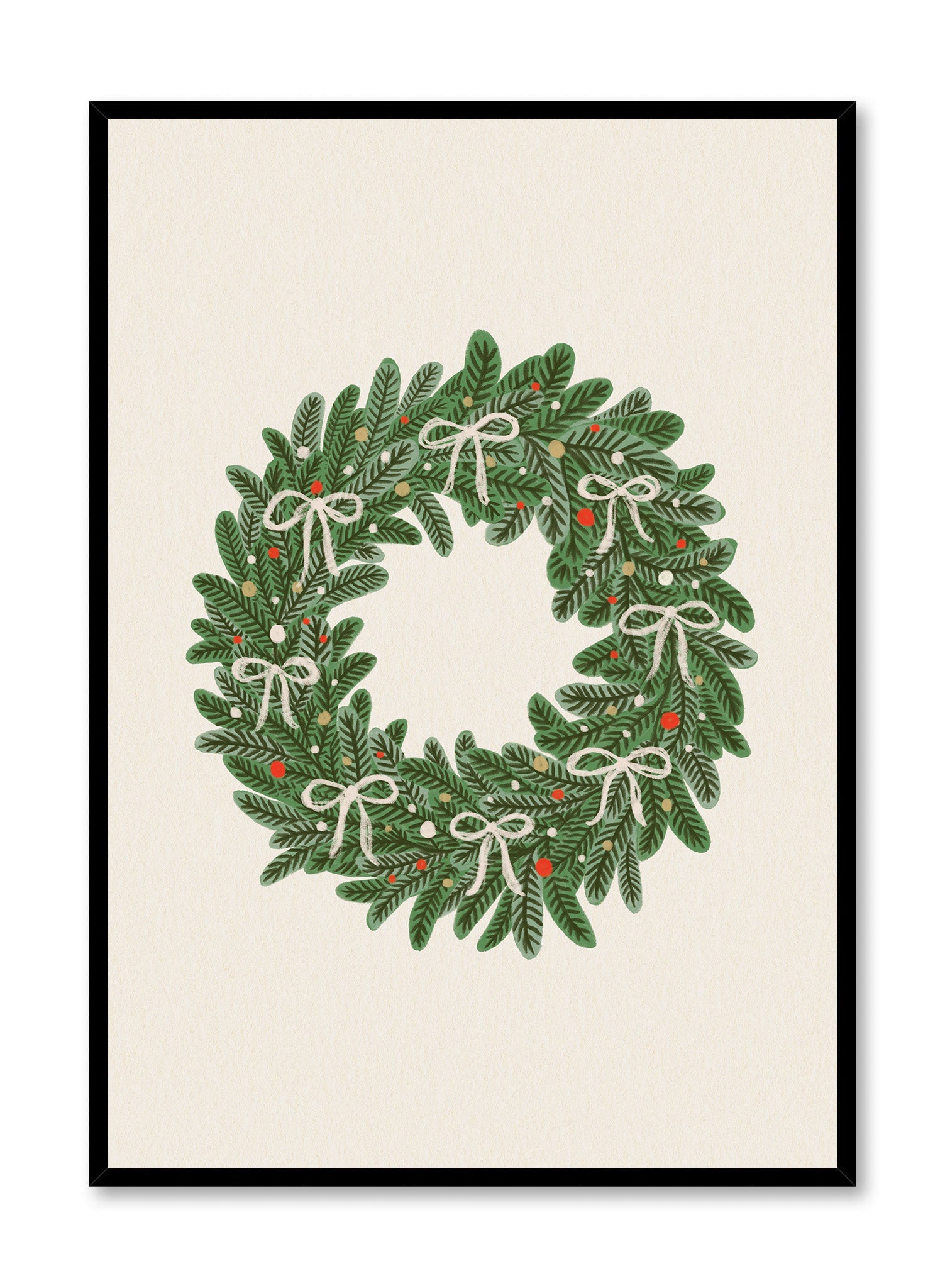 This print features a classic holiday wreath, meticulously crafted with lush green pine branches adorned with delicate white bows and subtle red berries. The wreath's circular form is both inviting and festive, capturing the spirit of the season with its elegant simplicity. The background is a soft, neutral tone, allowing the vibrant greens and subtle accents to stand out beautifully.